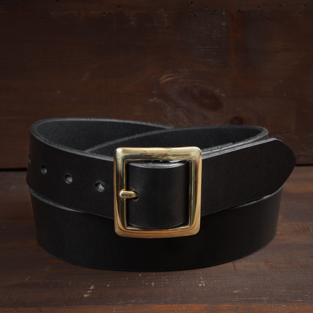 Sam svart läderbälte med mässingsspänne erbjuder tidlös stil och exceptionell hållbarhet.